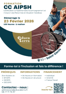 Dans le cadre de l’année 2026, Educaterra proposera 1 session de formation CC AIPSH programmée en Février.