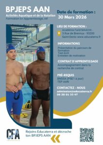 Le BPJEPS Éducateur Sportif – mention Activités Aquatiques et de la Natation (AAN) est une formation en alternance qui prépare à l’encadrement et à l’animation d’activités aquatiques, telles que la natation, l’aquagym ou les activités ludiques en milieu aquatique. Ainsi, elle permet d’acquérir les compétences nécessaires pour devenir éducateur aquatique et intervenir auprès de tous les publics. Par conséquent, les diplômés peuvent exercer dans des structures sportives, éducatives ou de loisirs aquatiques. De plus, cette formation offre une expérience pratique en alternance, favorisant l’adaptation à différents environnements professionnels.