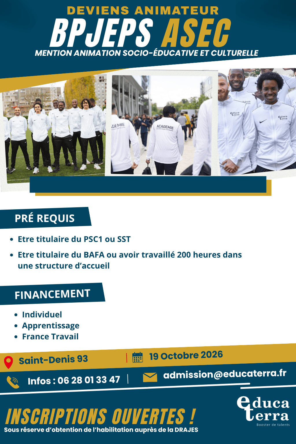 Le BPJEPS Animateur – mention Animation Socio-Éducative ou Culturelle (ASEC) est une formation en alternance qui vise à former à l’encadrement et à l’animation d’activités éducatives, sociales et culturelles. Elle permet de concevoir et de mettre en place des projets d’animation favorisant le lien social, l’inclusion et le développement des publics.
